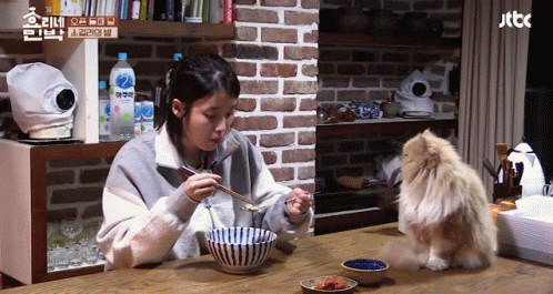 a woman is sitting at a table eating food with chopsticks while a cat sits next to her