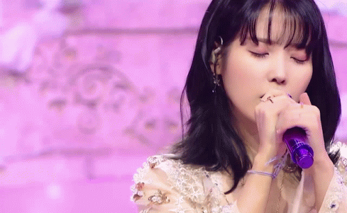 a woman singing into a purple microphone with her eyes closed