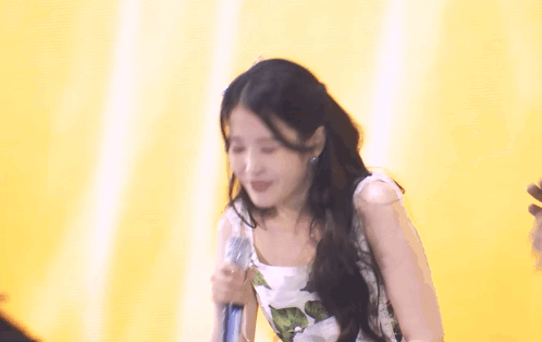 a woman is holding a microphone in front of a yellow curtain and smiling .