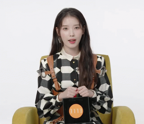 a woman sitting in a chair holding a black box with elle written on it