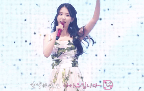 a woman in a white dress is holding a microphone in her hand and singing into it .