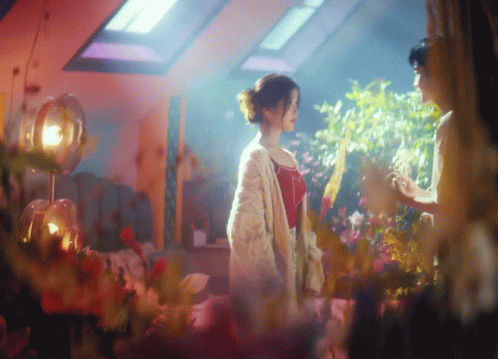 a woman in a white cardigan stands next to a woman in a red top