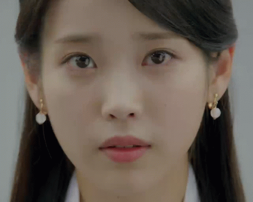 a close up of a woman wearing pearl earrings and a white shirt