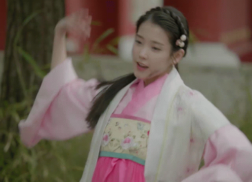 a woman in a pink and white dress is standing in front of a red building