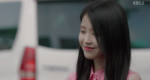 a woman in a pink shirt is smiling in front of a kbs2 vehicle