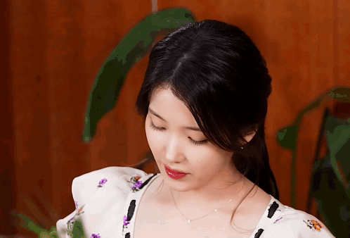 a close up of a woman with her eyes closed and a plant in the background