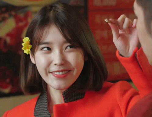 a woman with a flower in her hair is smiling and holding a ring
