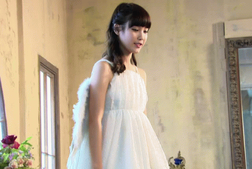 a young girl in a white dress with angel wings