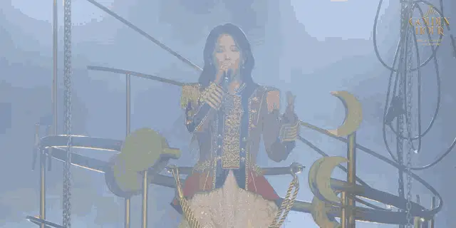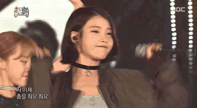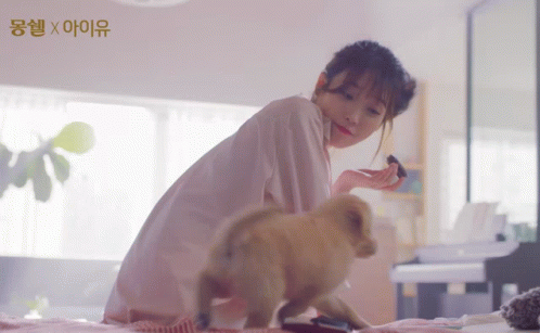a woman is sitting on a bed playing with a puppy and a sign above her says x