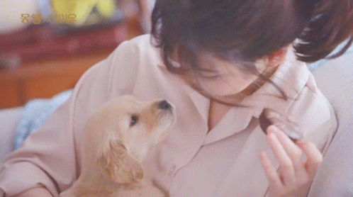 a woman is holding a puppy and eating a cookie with korean writing on the bottom