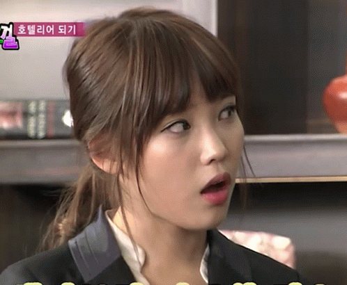 a woman with a surprised look on her face is in front of a sign with korean writing