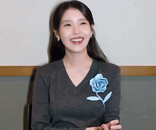a woman wearing a grey sweater with a blue flower on the front is smiling