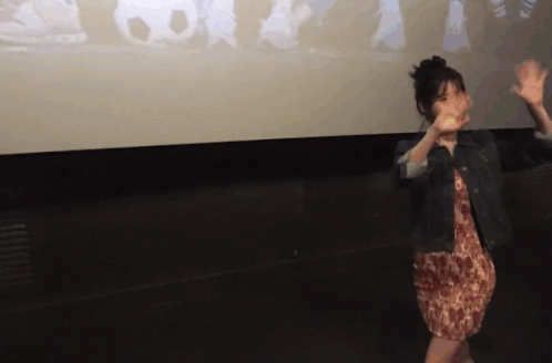 a woman in a dress and denim jacket is dancing in front of a screen