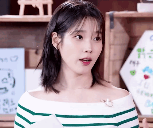 a woman in a green and white striped off the shoulder top looks surprised