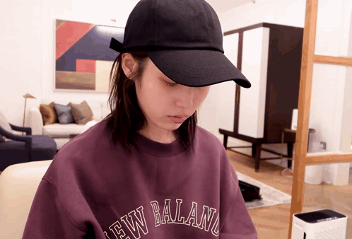 a woman wearing a black hat and a purple sweatshirt that says new balance