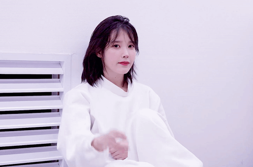 a woman in a white shirt sits in front of a wall