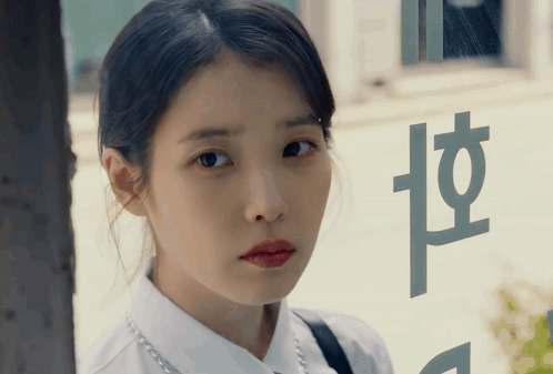 a woman in a white shirt stands in front of a window with chinese writing