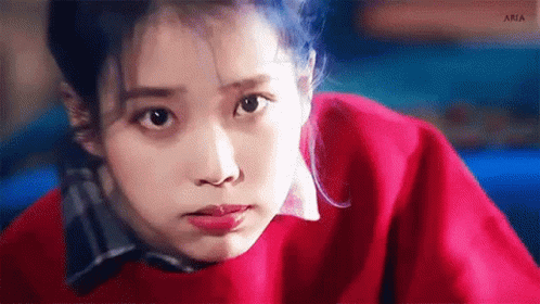 a close up of a woman wearing a red sweater and a blue shirt .