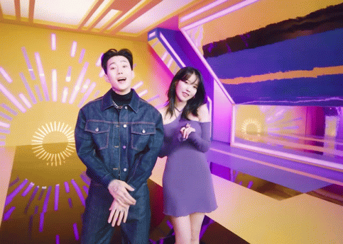 a man in a denim jacket and a woman in a purple dress are dancing