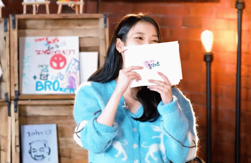 a girl in a blue sweater is holding a piece of paper with the word bro on it