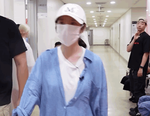 a woman wearing a mask and a hat with the letter m on it walks down a hallway