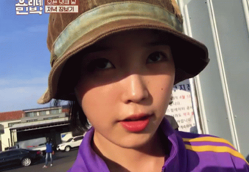 a woman wearing a hat and a purple jacket stands in front of a sign that says ' korean ' on it