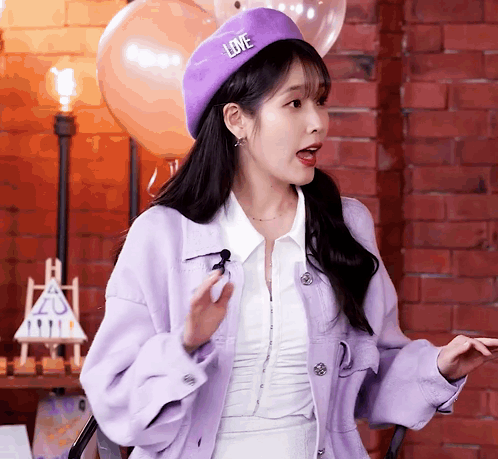 a woman wearing a purple jacket and a purple hat with the word love on it