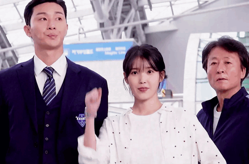 a man in a suit and tie stands next to a woman in a white polka dot shirt and a man in a suit and tie