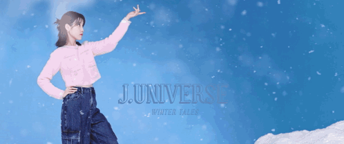 a girl in a pink sweater is standing in the snow with the words j universe winter tales written above her