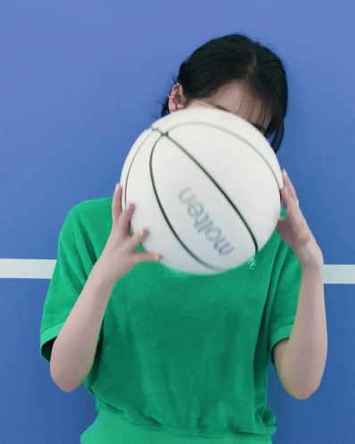 a woman holding a molten basketball in front of her face