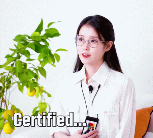 a woman wearing glasses is holding a cell phone and says " certified "
