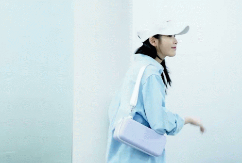 a woman wearing a white hat and a blue shirt is holding a purple purse