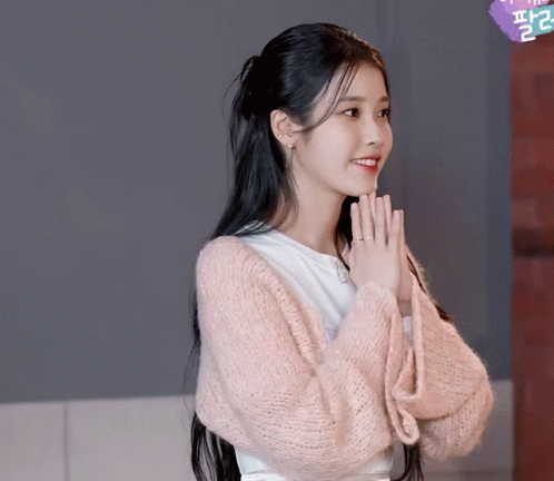 a woman wearing a white shirt and a pink sweater with her hands folded in prayer