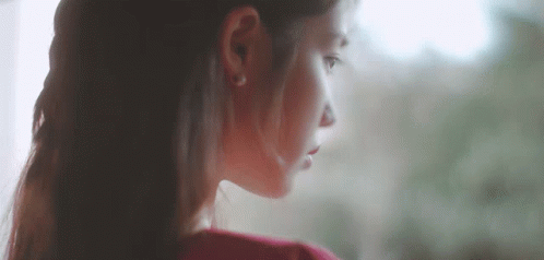 a close up of a woman 's face with a red shirt on looking out a window .