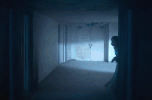 a woman in a white dress is walking down a hallway in a dark room