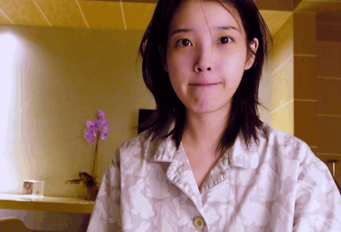 a woman wearing a pajama top looks at the camera with a purple flower in the background