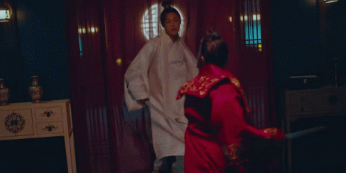 a man in a white robe is holding a large knife in a dark room .
