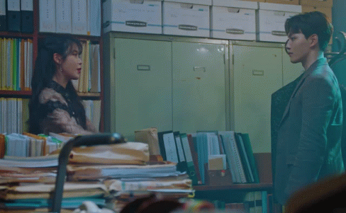 a man and a woman are standing in front of a stack of binders with one that says " binder box "