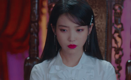 a woman wearing a white shirt and red lipstick is sitting on a chair