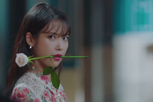 a woman is holding a rose in her mouth