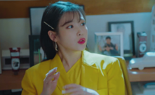a woman wearing a yellow jacket is standing in front of a desk with a picture of a man on it