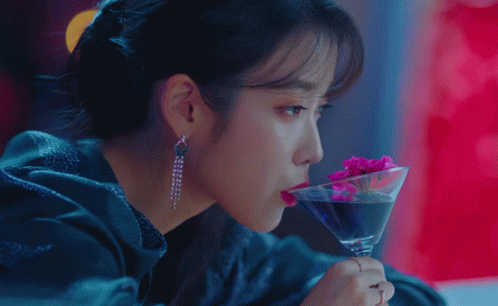a woman is drinking from a martini glass with flowers in it