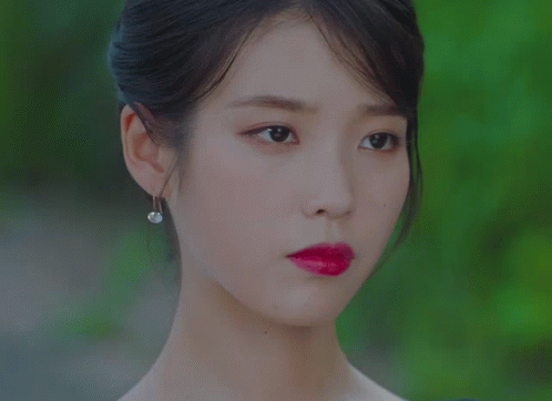 a close up of a woman 's face with earrings and red lipstick