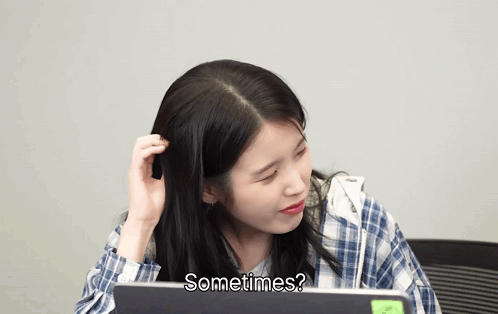 a woman in a plaid shirt is sitting in front of a laptop and asking " sometimes "