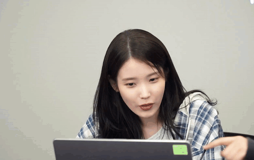 a woman is sitting in front of a laptop computer and pointing at the screen .