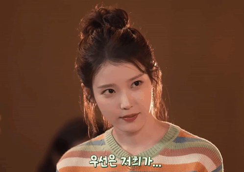 a woman wearing a striped sweater has a bun in her hair and a green sticker that says " 작년 " on it