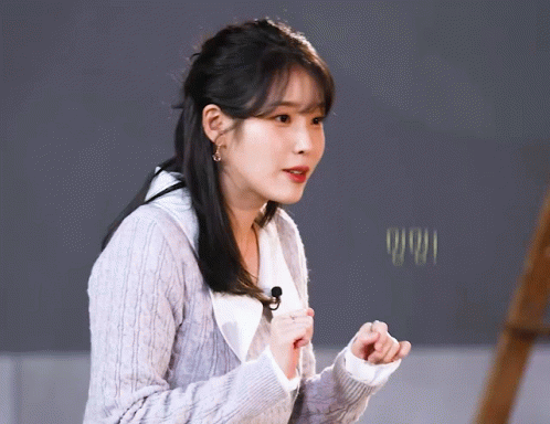 a woman wearing a gray sweater and a white shirt is talking into a microphone with korean writing behind her