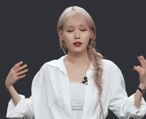 a woman wearing a braided ponytail and a white shirt with korean writing