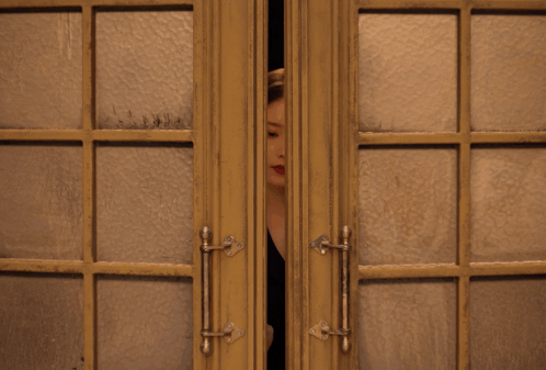 a woman in a black suit is peeking out of a door