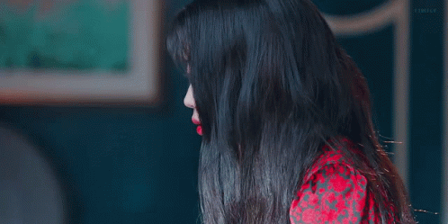 a woman in a red dress is looking at the camera while standing next to a man in a suit .
